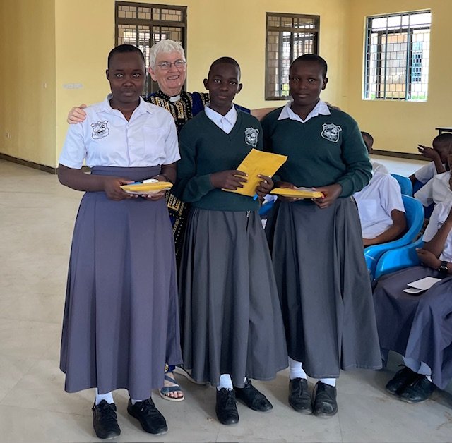 And $2800 to Anglican Aid. This money was used by Anglican Aid to sponsor two students (Photo: Helen Hoskins with Joyce Chacha and Ester Wanchoka - both wearing school jumpers) at the Bunda Girls Secondary School in Tanzania.